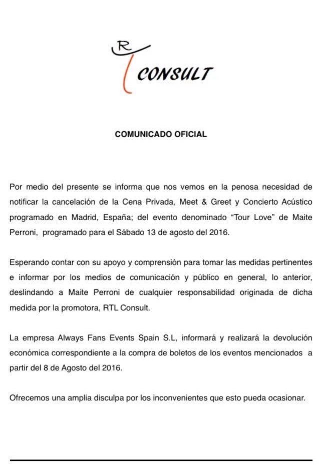 En el día de ayer se anuncio de forma oficial la cancelación del concierto que ofrecería Maite en nuestro país el dia 13 de este mes.